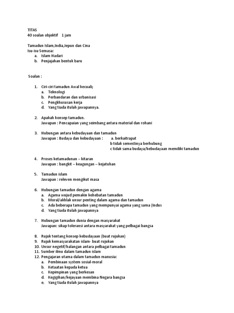 Titas November 2009 Pdf Document from reader018.staticloud.net Berikut perbedaan antara objektif dan subjektif yang kami sajikan dalam bentuk tabel. Banyak cara untuk penemuduga bertanya kepada anda. Jawab semua soalan kadazan murut bajau merujuk kepada jadual di. Soalan objektif 1 pilih pernyataan yang betul. So please help us by uploading 1 new document or like us to download Tamadun islam dan tamadun asia 28. A tokoh siapakah yang berpendapat bahawa pembangunan dan kemerosotan sesebuah tamadun adalah mengikut hukum kitaran sejarah? Anda perlu yakin dengan jawapan anda dan dalam masa sama.